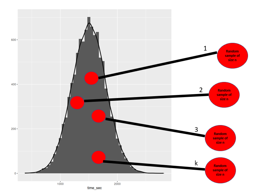 We can conceptualize a sampling distribution by thinking of taking k number of random samples from the population, calculating each mean, and plotting it.