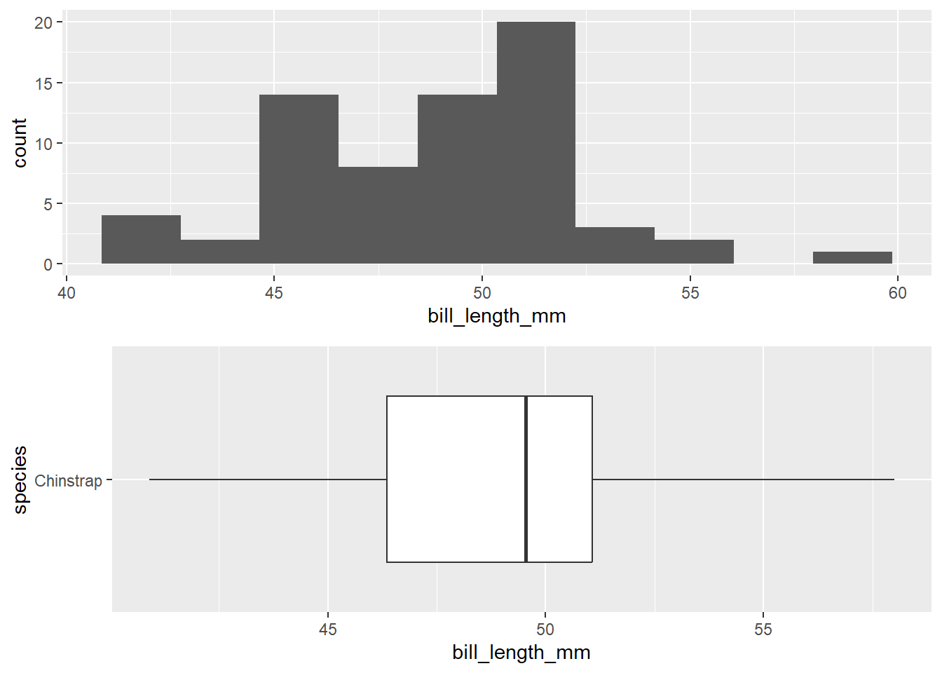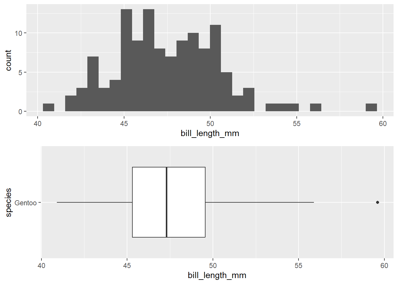 We are going to use a familiar data set (penguins) to demonstrate these theory based procedures. In this example, we are interested in exploring if the species of the penguin impacts the bill length (mm) of the penguin on the Palmer island. We will be looking at the Chinstrap and Gentoo species of penguin. We are interested in researching if there is a difference in bill length between the Gentoo penguins the Chinstrap penguins.