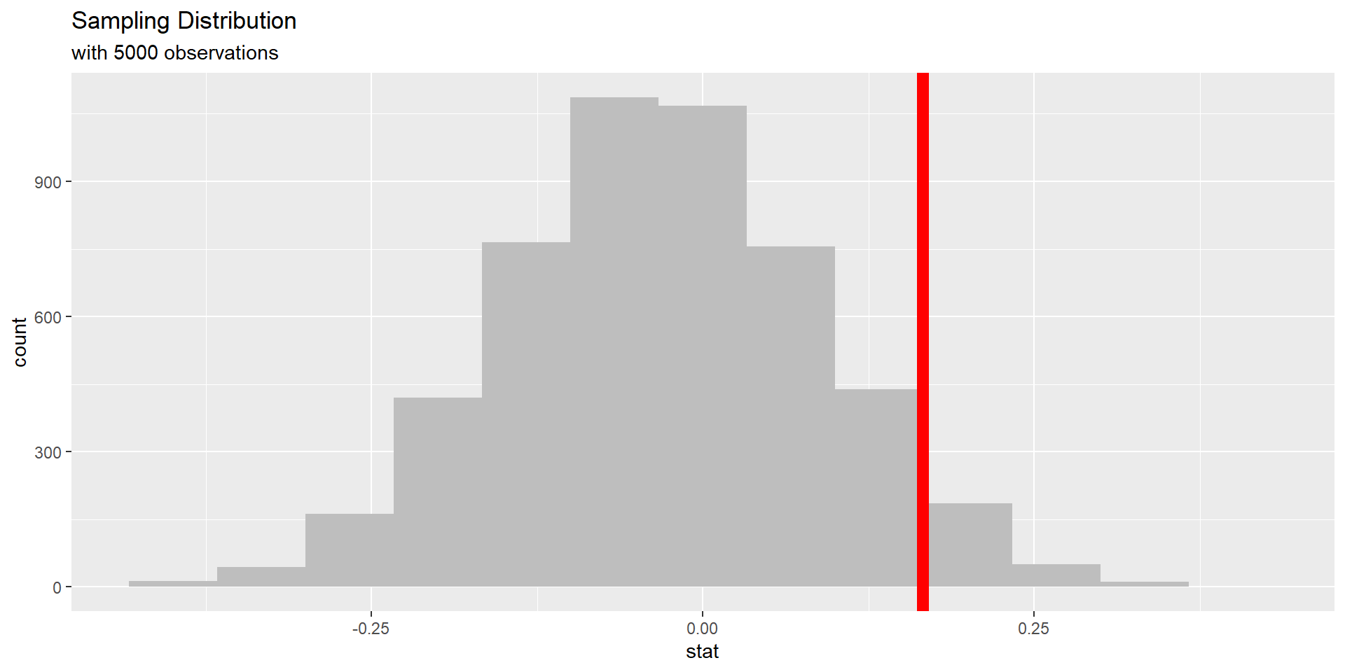 In as much detail as possible, describe how one dot (observation) on this simulated sampling distribution under the assumption of the null hypothesis is created.