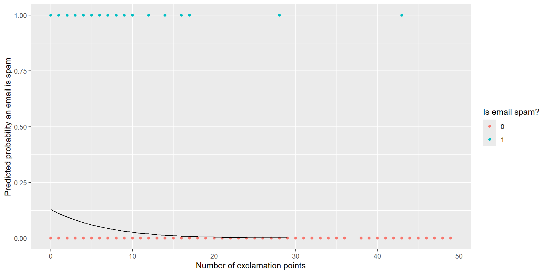 At the end of last class, we predicted the probability of a spam email when the number of exclamation points is equal to 10. How does that change our model below?